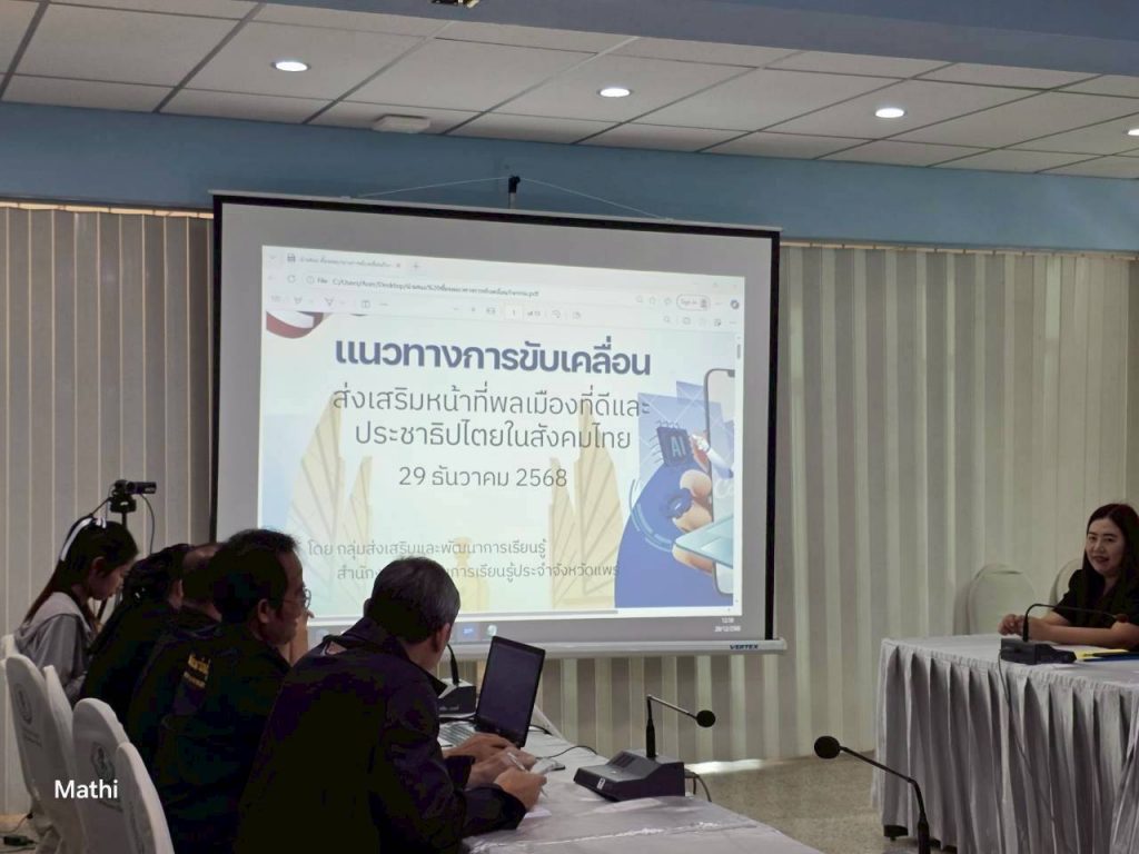 วันที่ 29 ธันวามคม 2568 สกร.ระดับอำเภอสูงเม่นนำโดย นางสาวศิริลักษณ์ มั่นเหมาะ ครู รักษาการในตำแหน่ง ผู้อำนวยการ สกร.ระดับอำเภอสูงเม่น พร้อมด้วยคณะครูศูนย์การเรียนรู้ เข้าร่วมอบรมโครงการส่งเสริมหน้าที่พลเมืองที่ดีและประชาธิปไตยในสังคมไทย ระดับจังหวัด เพื่อดำเนินาการจัดกิจกรรมรณรงค์ในพื้นที่ที่รับผิดชอบให้บุคลากรในสังกัดทราบถึงแนวทางการดำเนินงาน ที่ถูกต้อง และชัดเจน เป็นไปในทิศทางเดียวกัน ณ ห้องประชุม ชั้น 2 สำนักงาน สกร.ประจำจังหวัดแพร่